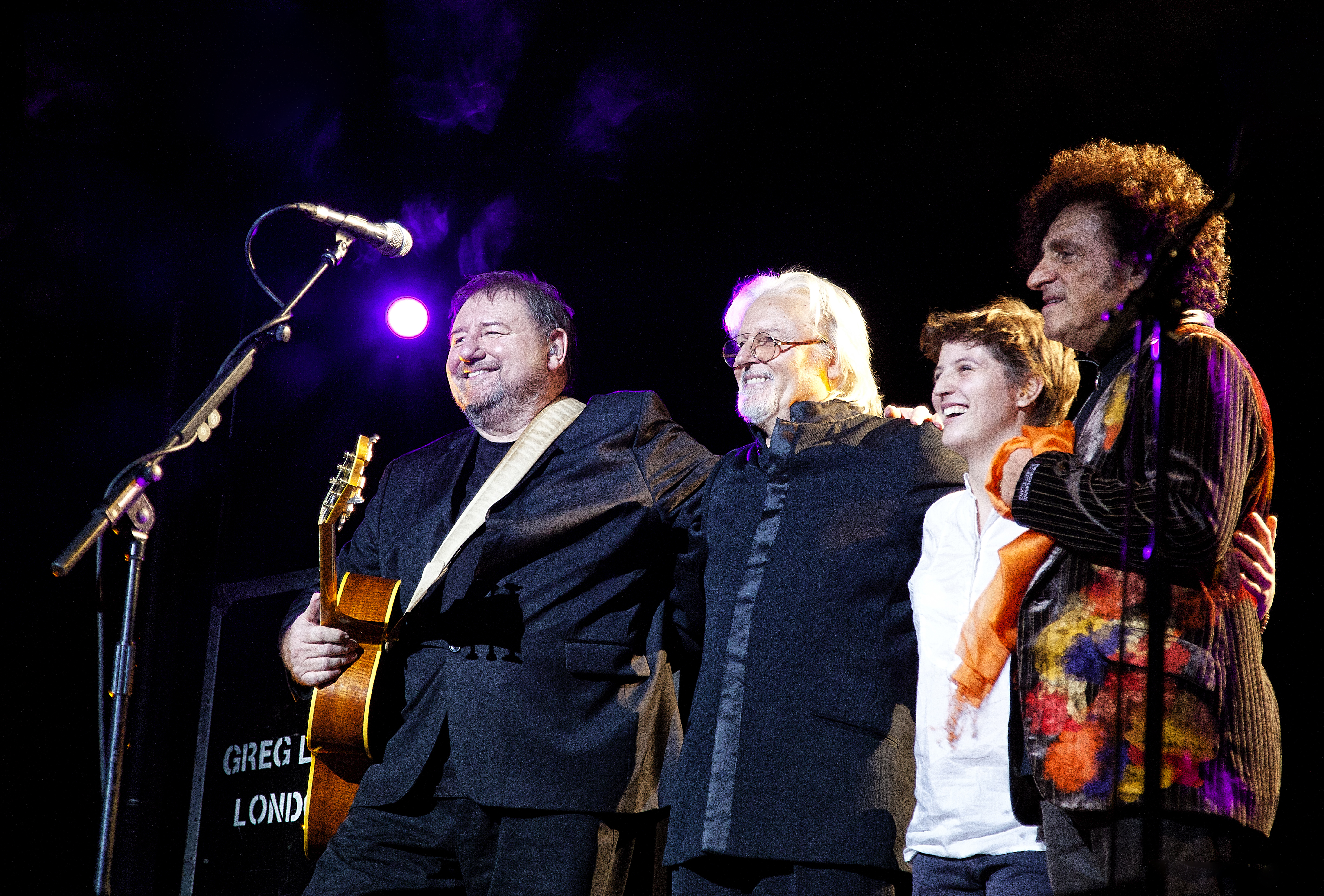 l to r: Greg Lake, Aldo Tagliapietra, Annie Barbazza, Bernardo Lanzetti – Teatro Municipale, Piacenza 2012 (foto Soprani)