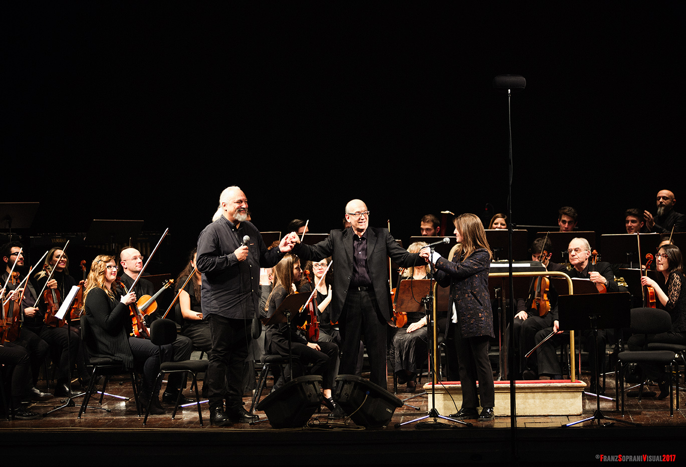 Eugenio Finardi, Camillo Mozzoni, Annie Barbazza and Max Repetti with the Conservatorio G. Nicolini Orchestra – Teatro Municipale, Piacenza – 2017 (foto Soprani)